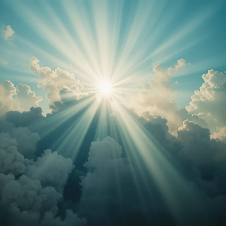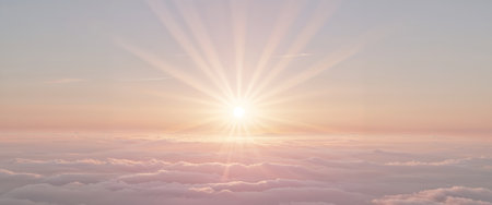 A vivid image of the sun rising or setting, with its bright rays spreading outwards through a layer of fluffy clouds. The sun's light creates a stunning display of beams that pierce through the clouds, illuminating the sky with a warm, golden glow. The scene evokes a sense of tranquility and natural beauty.