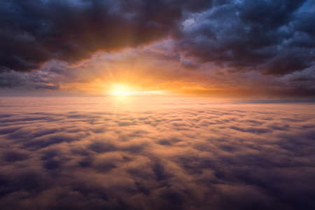 Beautiful sunset cloudy sky from aerial view. Airplane view above clouds
