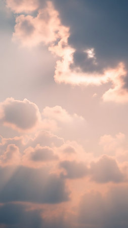 A serene sky filled with soft pink and grey clouds, illuminated by diffused sunlight creating a tranquil and atmospheric scene.