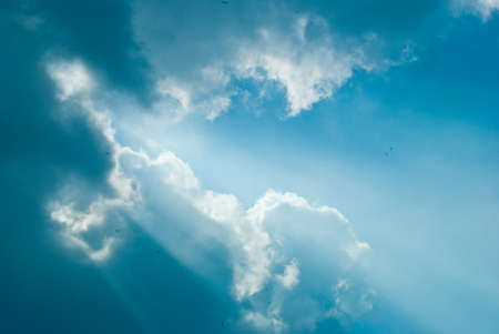 Sun rays breaking through cumulus clouds. The concept of divine light, a glimmer of hope or overcoming difficulties. Spiritual religious abstract background.