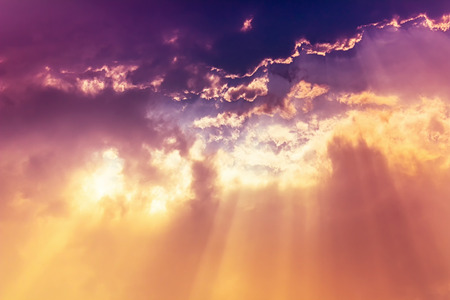 Blurred beautiful dramatic impressive meditation background. Sun rays shining through the dark blue clouds at sunset. Concept of hope or God's compassion and favor.