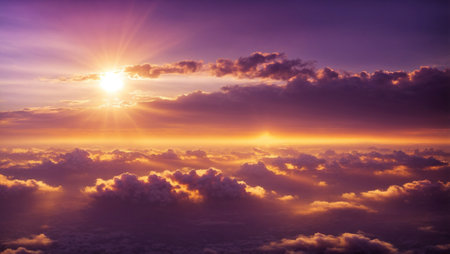 Sunrise above clouds with vibrant colors and sun rays