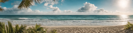 Ocean coast panorama in calm weather with small waves, blue sky, white clouds and bright sun. palm leaves in the foreground. seascape illustration. Generative AI