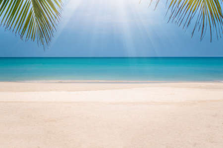 Tropical nature clean beach and white sand in summer with sun light blue sky and bokeh abstract background.