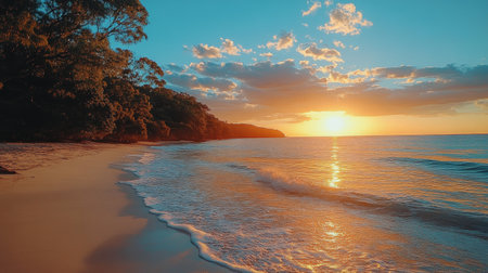 Sun sets on a peaceful beach, casting golden hues over calm waters. Lush trees line the shoreline, creating a serene atmosphere during twilight.