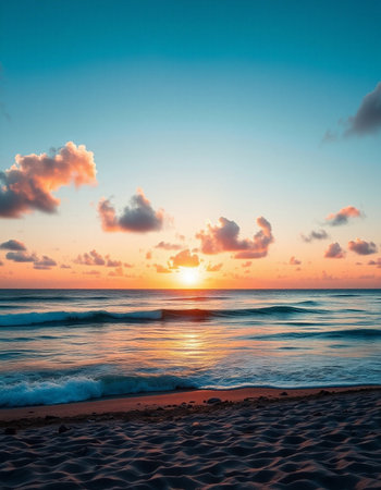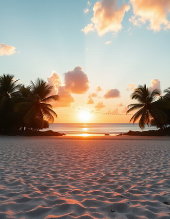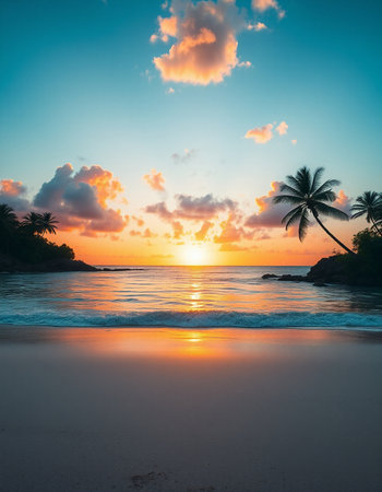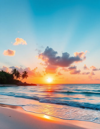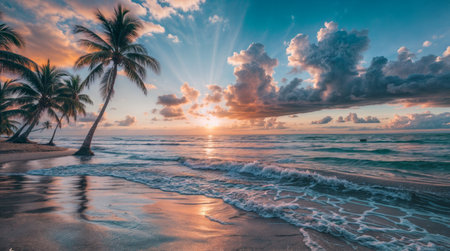 A stunning sunrise over a tropical beach, with gentle waves and palm trees silhouetted against a colorful sky, evoking tranquility.