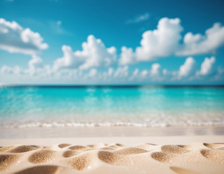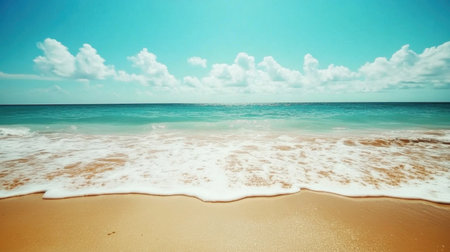 Art beach scene with gentle waves, sandy shoreline. Bright colors create peaceful atmosphere. Generated AI. Sunny beach holidays travel concept. Copy space. Sunny tropic paradise. Plage background.