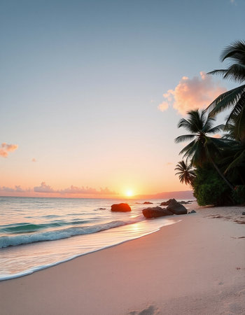 Illustration of a tropical beach at sunrise, with gentle waves lapping at the shore and palm trees swaying in the breeze. The soft pastel colors in the sky reflect the early light, giving the scene a dreamy, relaxing feel.