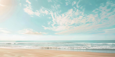 Minimalist summer beach background with soft sand, a calm ocean, and plenty of space for mockups or text