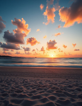 Sandy shoreline stretching out under a vibrant sky, with calm waves lapping on a warm, sunny day.