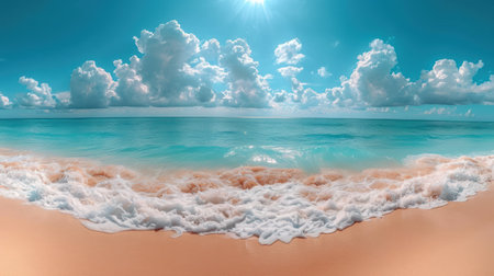 A serene view of a tranquil beach with crystal-clear water, golden sand, and gentle waves lapping at the shore. The sky is bright blue with fluffy clouds and the sun shines brightly.