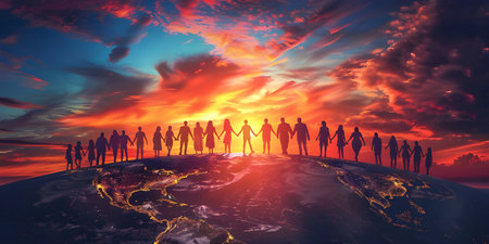 Diverse Group of People Silhouetted Against a Vibrant Sunset, Symbolizing Togetherness and Unity