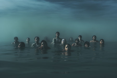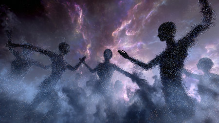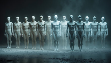 Artistic representation of humanoid figures in foggy space, exploring identity and existence in a captivating display