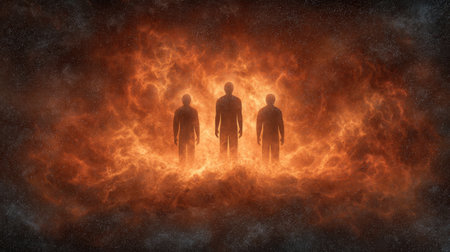 Three silhouetted figures stand boldly in a fiery nebula, embodying adventure and mystery. This artwork captures the essence of exploration in a cosmic environment.