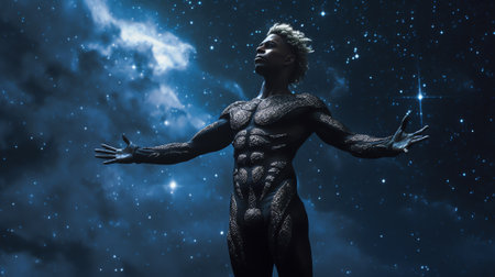 A powerful depiction of human potential and spiritual awakening. Vibrant cosmic energy radiates from a man's form, symbolizing connection to the universe and inner light.