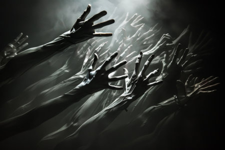 apocalyptic cityscape overrun by creepy zombies emerging from graves. Generative AI