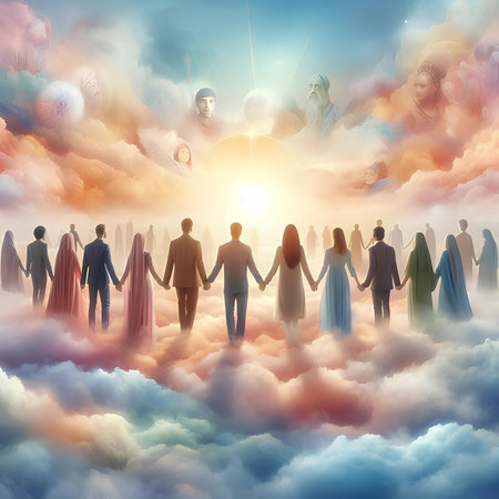 Celestial beings, ethereal glow, shared dreamscape, unity in thoughts, floating on clouds, realistic image, Soft focus, Chromatic Aberration effect, Aerial view