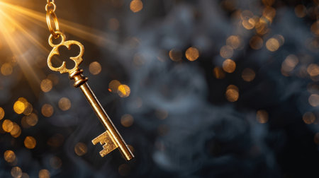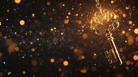 A beautifully detailed golden key dangles amidst sparkling bokeh lights, evoking a sense of mystery, elegance, and magical charm.