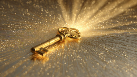 This stunning image showcases an ornate golden key beautifully positioned against a shimmering backdrop, exuding elegance and mystery. The soft glow and intricate details create a captivating visual perfect for themes of luxury, discovery, and magic.