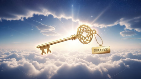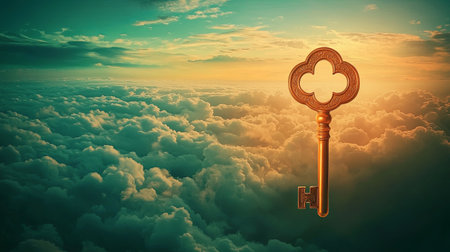 A golden key, the central element, floats among fluffy white clouds under a bright sky. The digital artwork uses soft lighting and a fantasy style. This visual metaphor conveys themes of achievement and access. It is appropriate for various commercial applications, including advertising and editorial content.