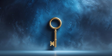 AI Generated. Golden Key on Cosmic Blue Textured Background