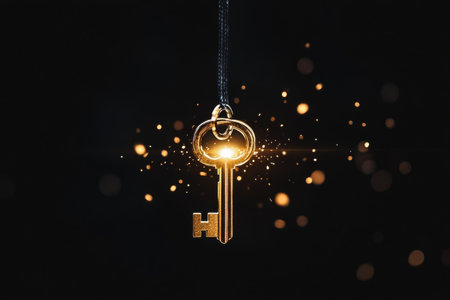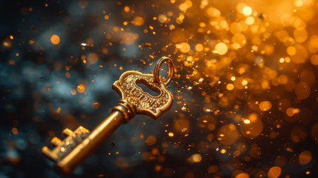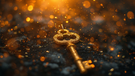 A golden key stands upright on a dark surface illuminated by shimmering light particles. The atmosphere captures a blend of mystery and elegance, attracting attention to the key.