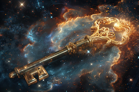 A single, luminous key floats amidst the breathtaking colors of a cosmic nebula. This mystical object represents unlocking the secrets of the universe, discovering hidden potential, and the infinite possibilities that await on a journey of exploration and imagination.