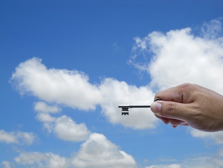 hand holding keys on sky background