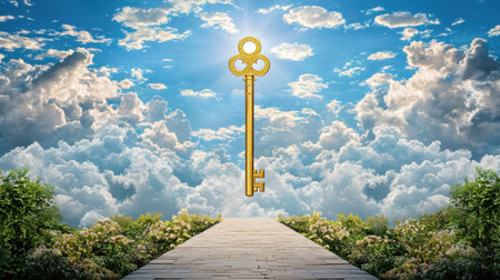 A stunning golden key floats against a backdrop of bright clouds and sunlight, symbolizing hope and potential. A serene pathway leads to endless possibilities.