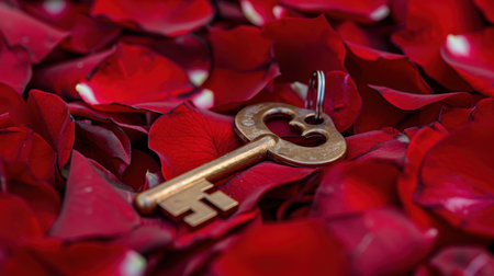 A beautiful vintage key rests on a bed of vibrant red rose petals, symbolizing love and romance. Perfect for decoration, photography, and invitations.