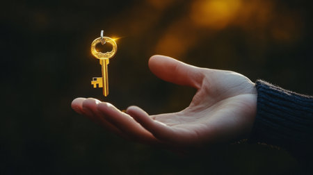 Isolated hand holding a floating golden key generative ai