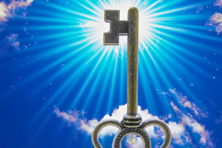 a golden divine key, suspended gracefully in the expanse of a serene blue and white sky, radiating an aura of mystique and spiritual significance