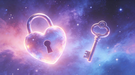 A creative digital illustration depicting Heart-shaped lock and key floating in cosmic nebula, surreal space composition, starry nebula lighting, symbolic surrealism style, destined connection mood, cosmic 123RF stock. This AI-generated artwork features unique visual elements suitable for various commercial and editorial applications. AI-generated illustration.