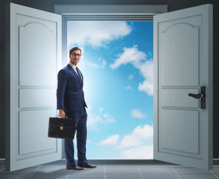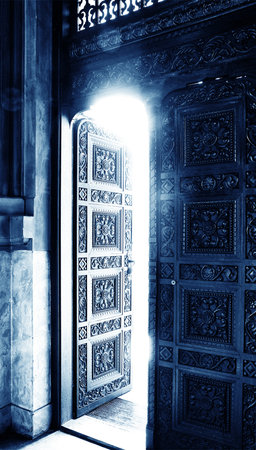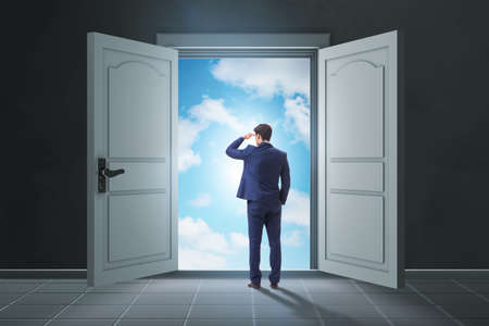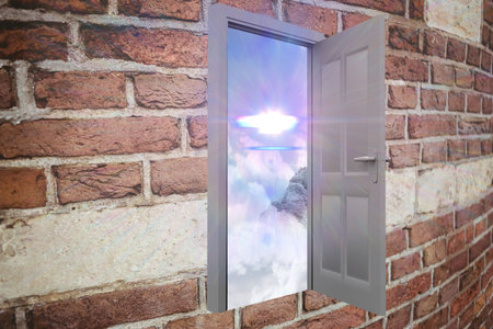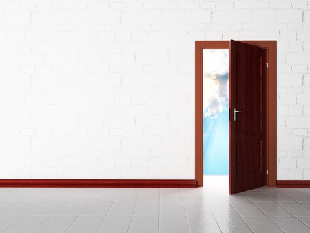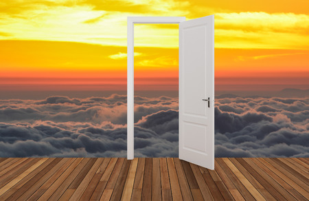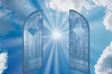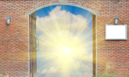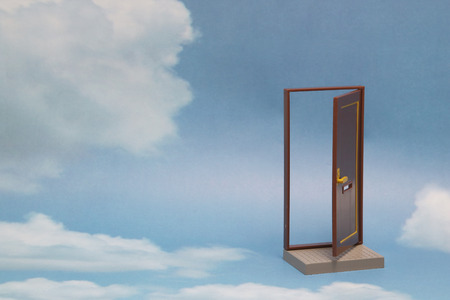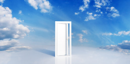 Door to the new world. Open door on blue sunny sky with fluffy clouds. Concepts like new life, success and future perspective, hope, religion.