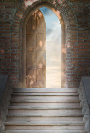 Door to Heaven. Arched passage open to heaven`s sky. Light at end of the tunnel. Hope metaphor.