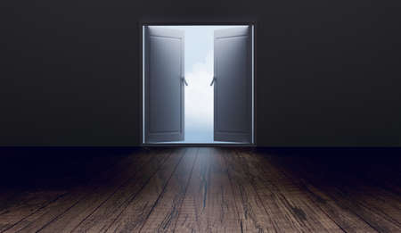 Open door in the dark room leading to the blue sky. 3D illustration.