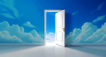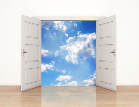 Open door to blue sky with fluffy clouds. Hope, new life, change concept.