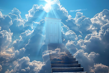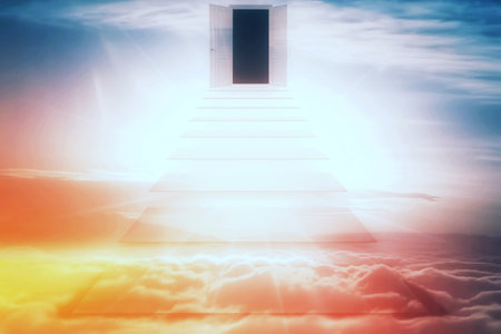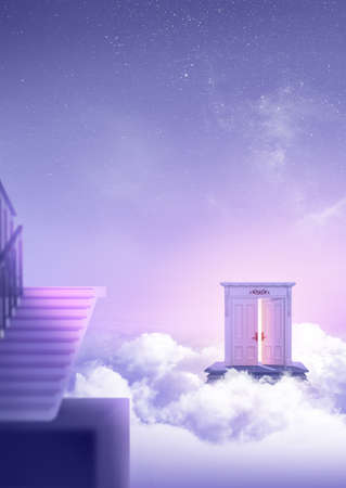 Conceptual image of opened door in clouds with stairs leading to heaven