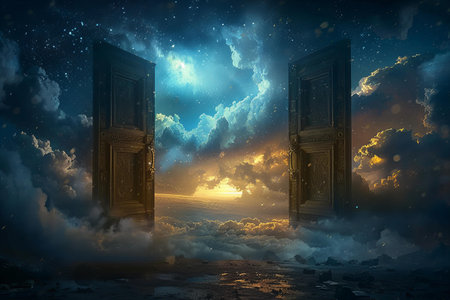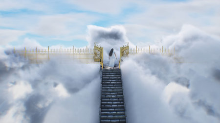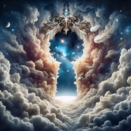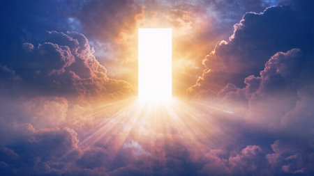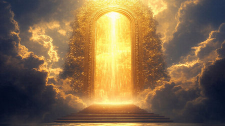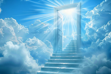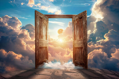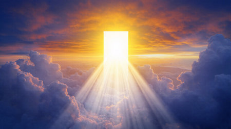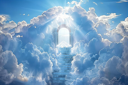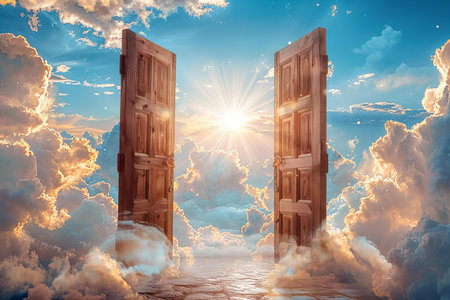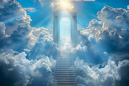 Heavenly gates opening in the clouds, surrounded by divine light, symbolizing paradise and eternal peace