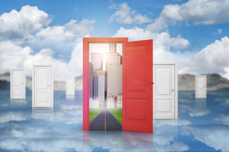 3d rendering of a cloudy space with many identical white doors and a single red door leading to a business district.