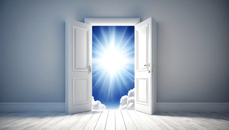 A stunning scene of light breaking through an open doorway, revealing dramatic clouds. This image evokes feelings of hope and possibility, perfect for creative projects.