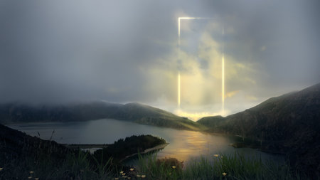 Composite image. Golden portal rising above calm lake in misty mountains, blending with soft morning light. Concept of mystery and fantasy, time travel, dreamlike landscapes, futuristic nature.