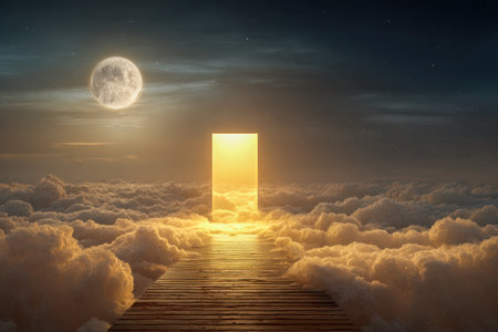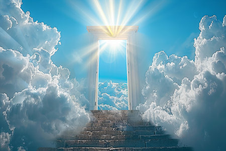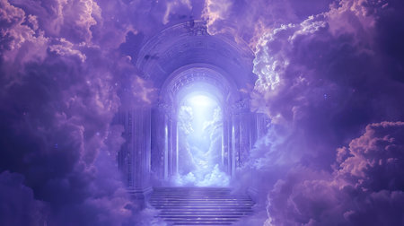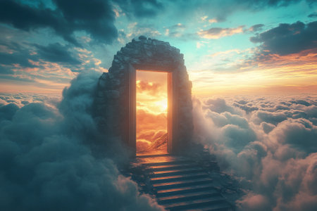 Stairs rising to a glowing archway amidst celestial clouds. Pathway ascending to a luminous portal through the heavens. Concept of ascension, divine entry, mysticism, and surreal exploration.