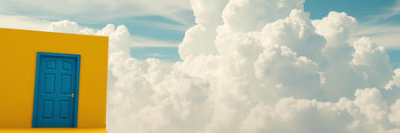 Conceptual 3D yellow door on blue sky with clouds background banner