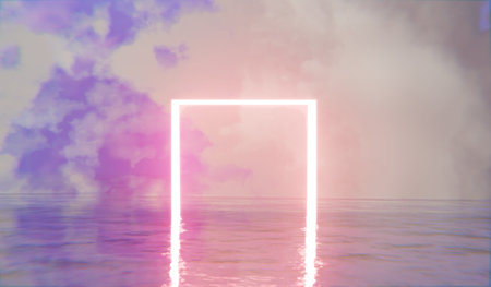Light portal door is reflected in water. Door to other worlds and galaxies in the sea. Journey into the future to the stars and nebulae. 3d rendering