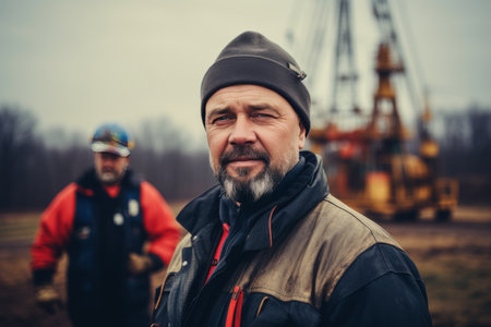 A serious oilman with a beard and a stained jacket at work on a drilling rig