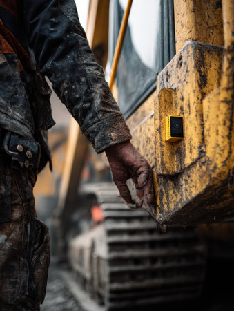 A construction worker in dirty clothes stands beside heavy machinery, adjusting equipment while dust fills the air at an active work site during daytime.