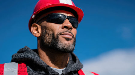 Portrait of an African American construction worker in a hard hat and safety vest after a hard day of work. Manual labor concept