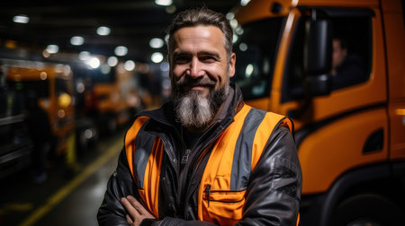 A bearded male driver in an orange and black jacket poses confidently in a busy warehouse, smiling in front of orange trucks.