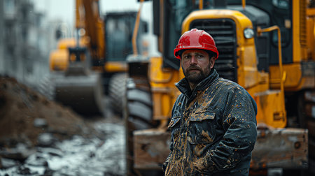 Portrait of a construction worker in a helmet with a construction machine on the background